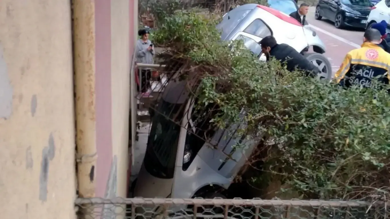 Yaşlı sürücü, dar sokakta manevra yaparken aniden panikleyerek frene basmak yerine gaz pedalına basınca korkunç bir kaza meydana geldi. Araç kontrolden çıkarak sokak üzerindeki bir binanın çevre duvarını aşarak bahçeye düştü. Aracın içinde sıkışan sürücü İ.K. metrelerce yükseklikten aşağıya düştü.